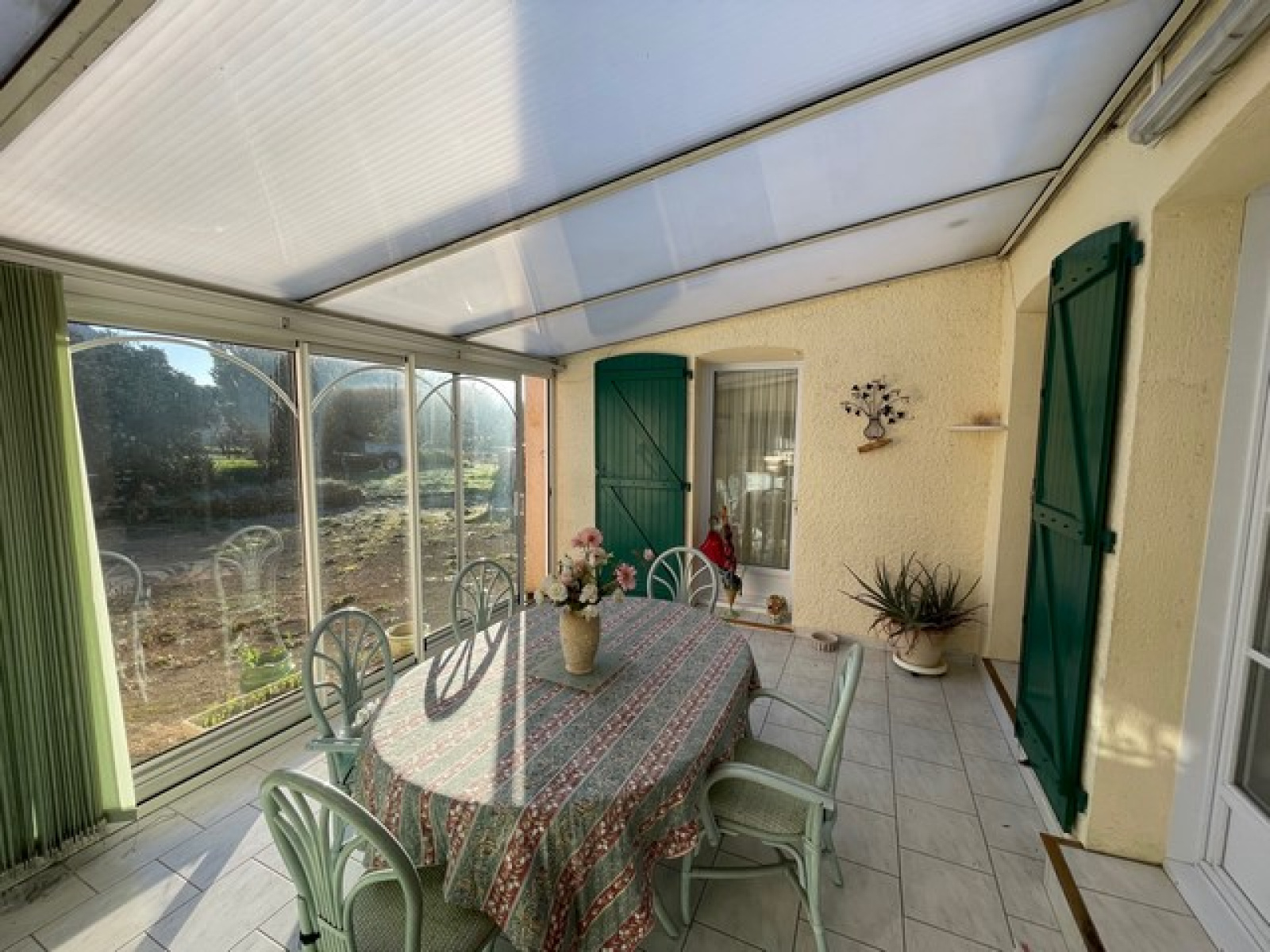 Ce pavillon de plain-pied de 102 m² se compose d'une entrée, une cuisine équipée, un salon avec cheminée et insert, une véranda, 2 chambres, un bureau, une salle d'eau, des toilettes et une buanderie. Un garage avec grenier de rangement et un abri de jardin. Aspiration centralisée et portail électrique avec interphone. Sur un terrain arboré de 955 m².