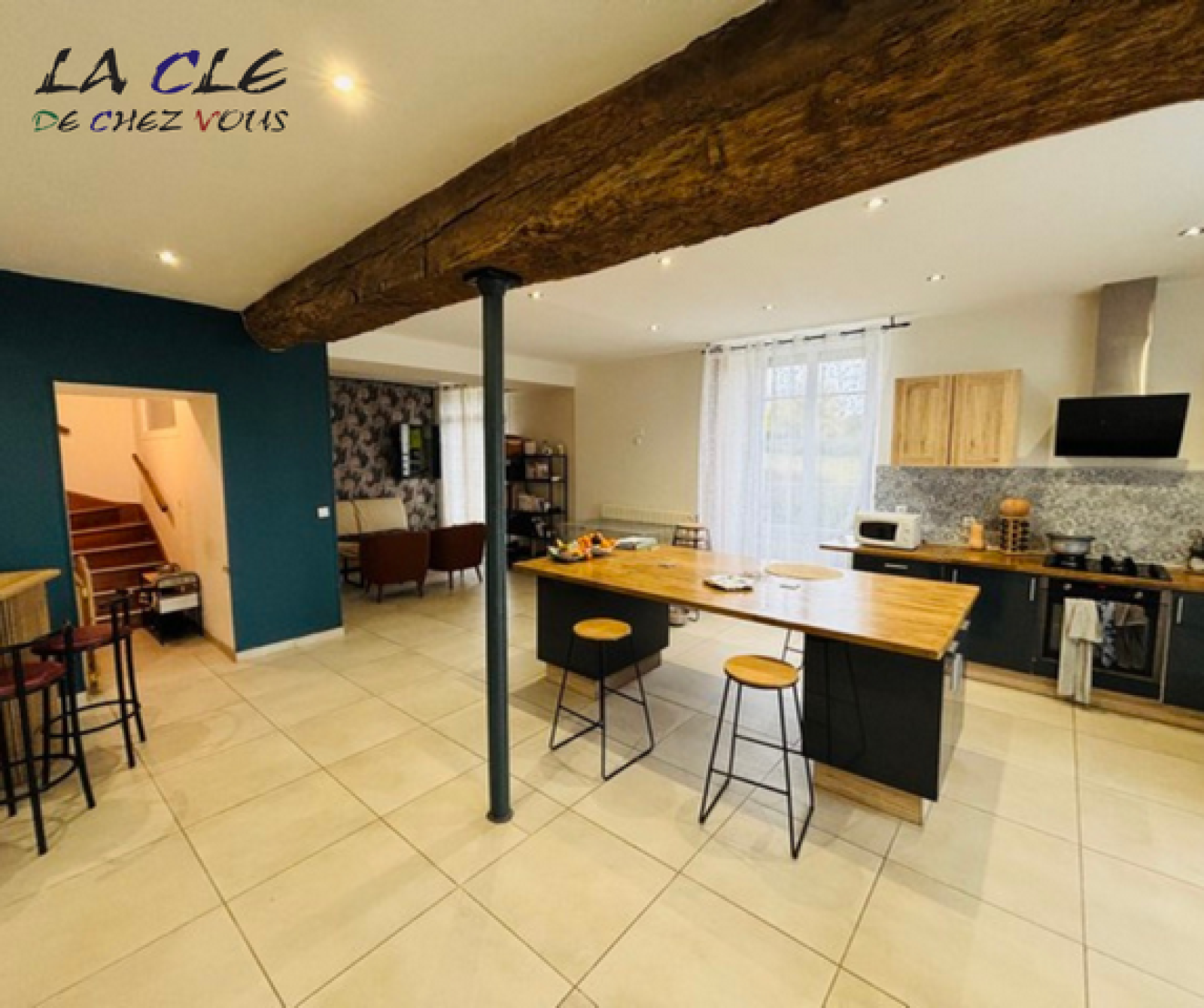Comprenant au rez-de-chaussée un séjour avec cuisine équipée et un poêle à granulés, une salle de bains, des toilettes et un garage.